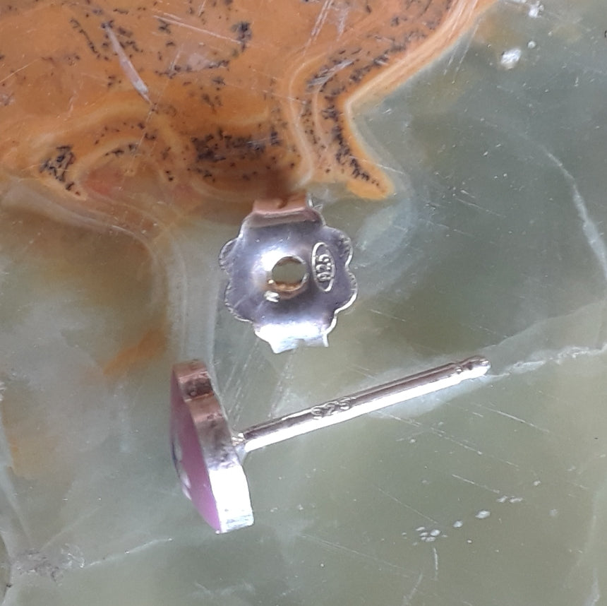 These sterling silver stud earrings have pink enameled hearts with a flower shaped pattern in the middle. Lightweight, but sturdy posts with tension backs. A great pair of earrings to gift. Matching bracelet and pendant available.
