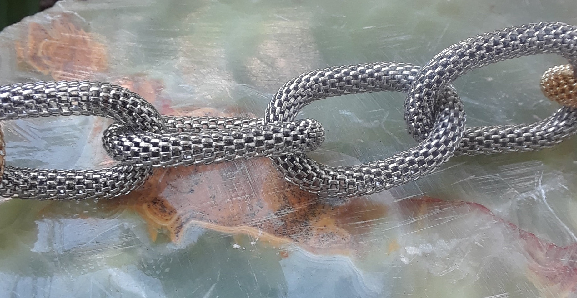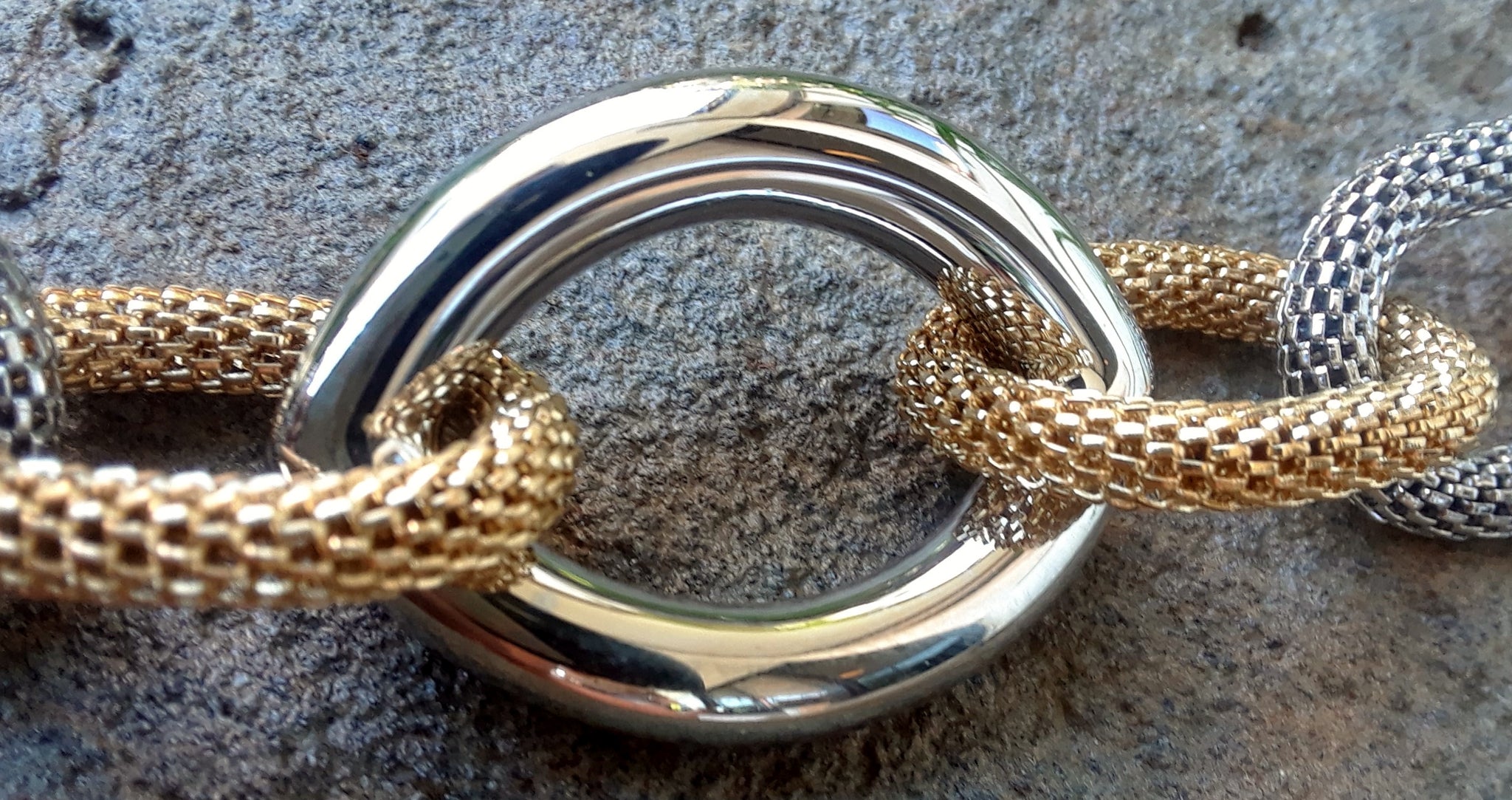 This beautiful, high-end, high-fashion necklace is 18" long with an adjustable chain and lobster clasp closure. These stainless steel, mesh loops create chain-links with a combination of high-polished gold-plated steel links. This two-toned necklace is 20 mm wide with an excellent finish. A large and bold piece of designer jewelry and a great item to mix and match with other jewelry.
