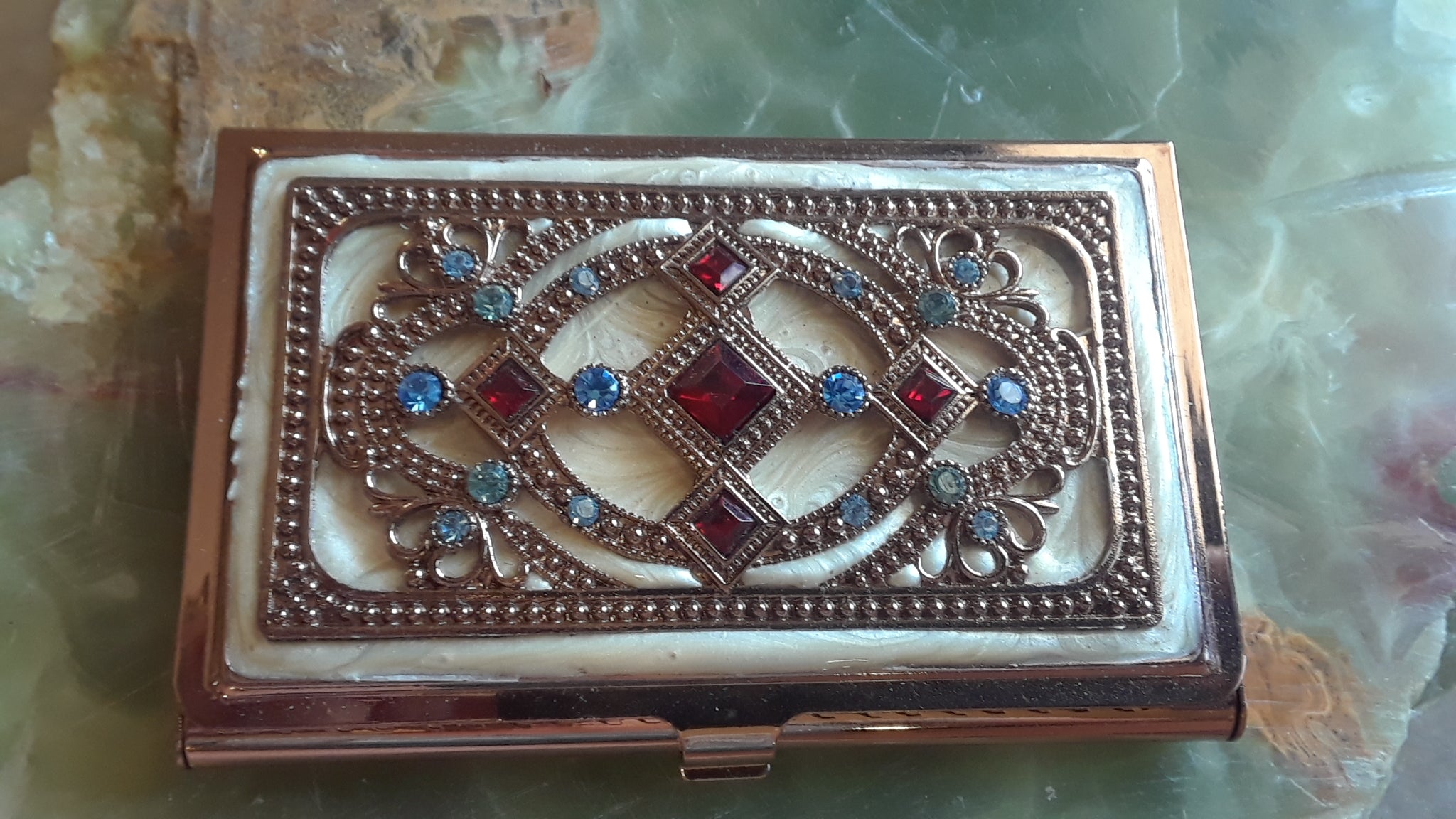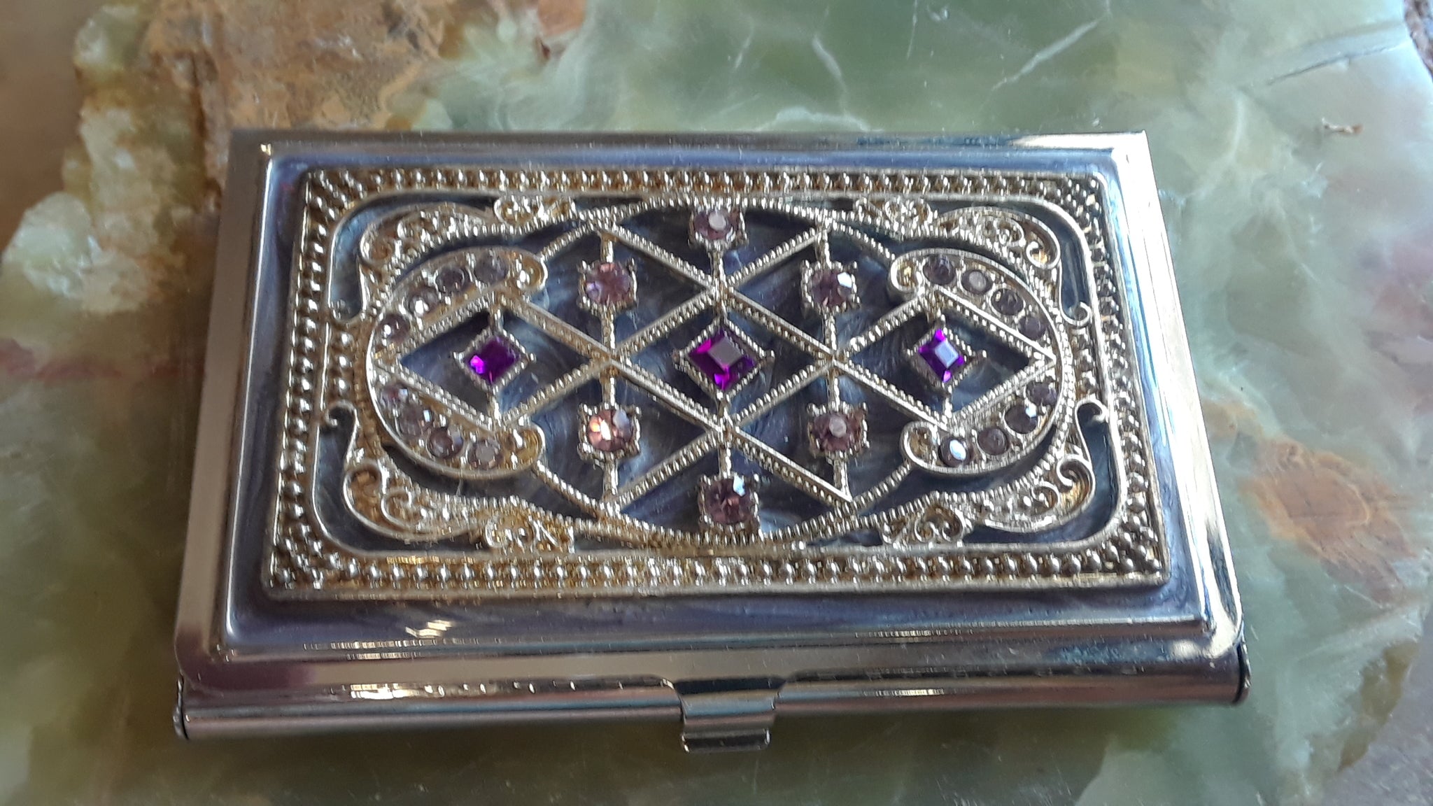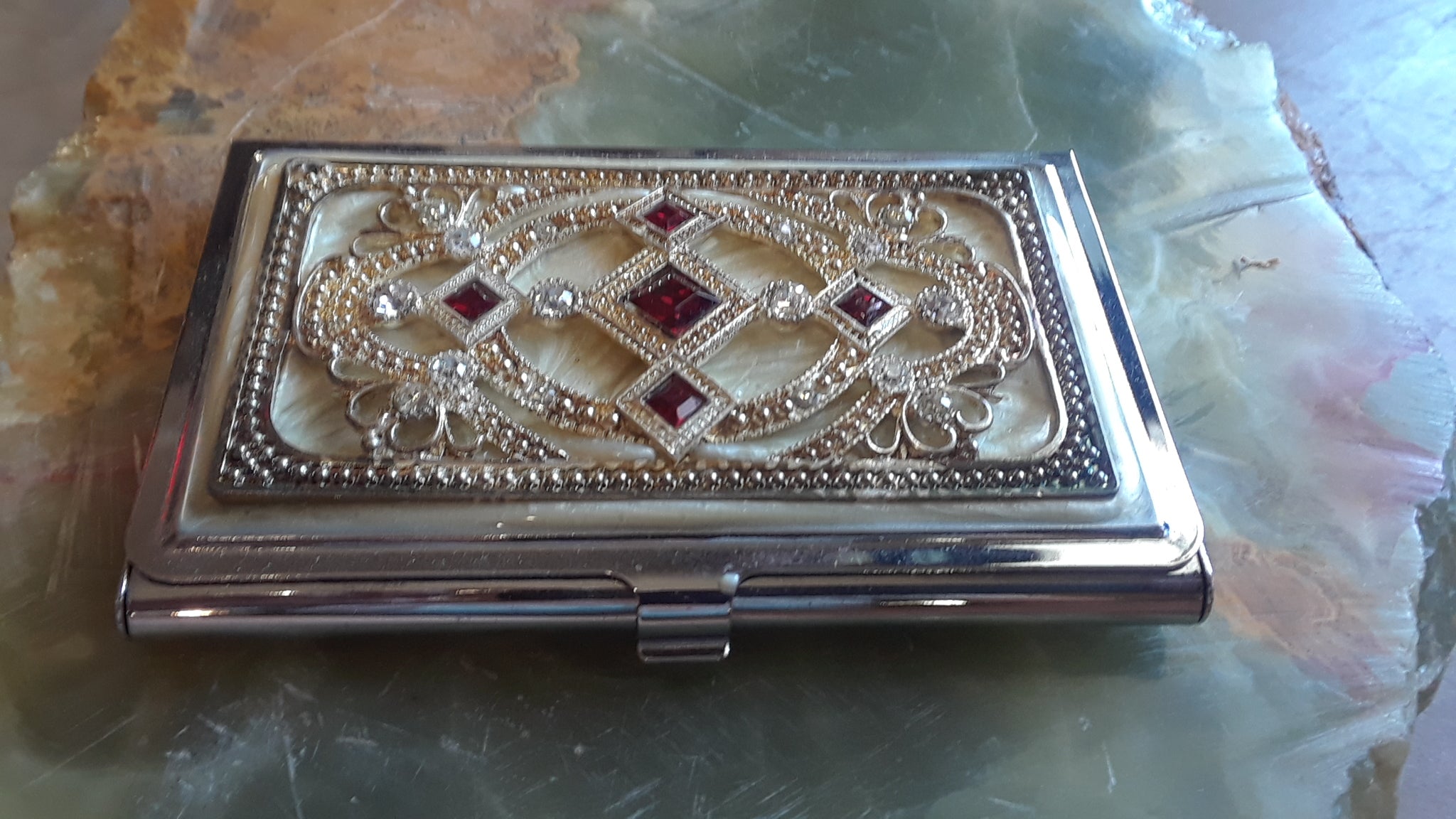 Beautiful business card holders. Silver or gold-toned metal with crystal accents, and black velvet lining. With a secure snap closure, and detailed engraving inside the case, this business card holder accessory to have and enjoy.