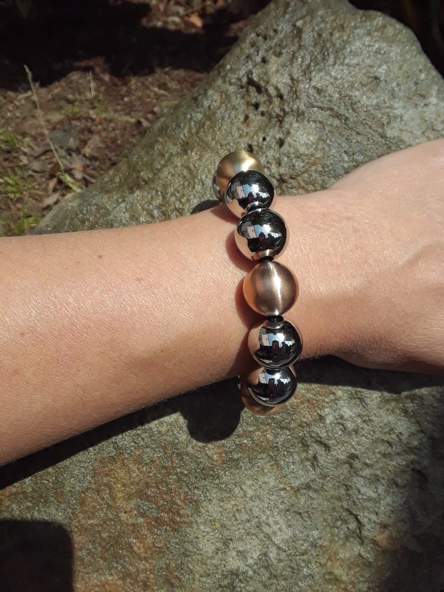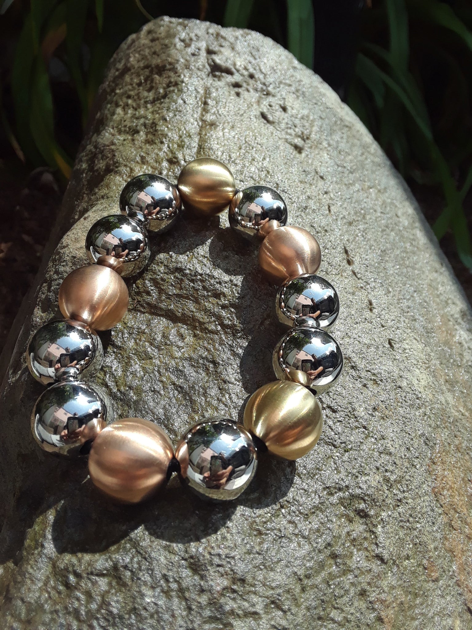 A combination of high polished stainless steel, brushed copper, and brushed brass  beads gives this bracelet a two-toned look to compliment any style.  This adjustable & stretchable bracelet slides on and off the wrist with ease, very comfortable and easy to wear.