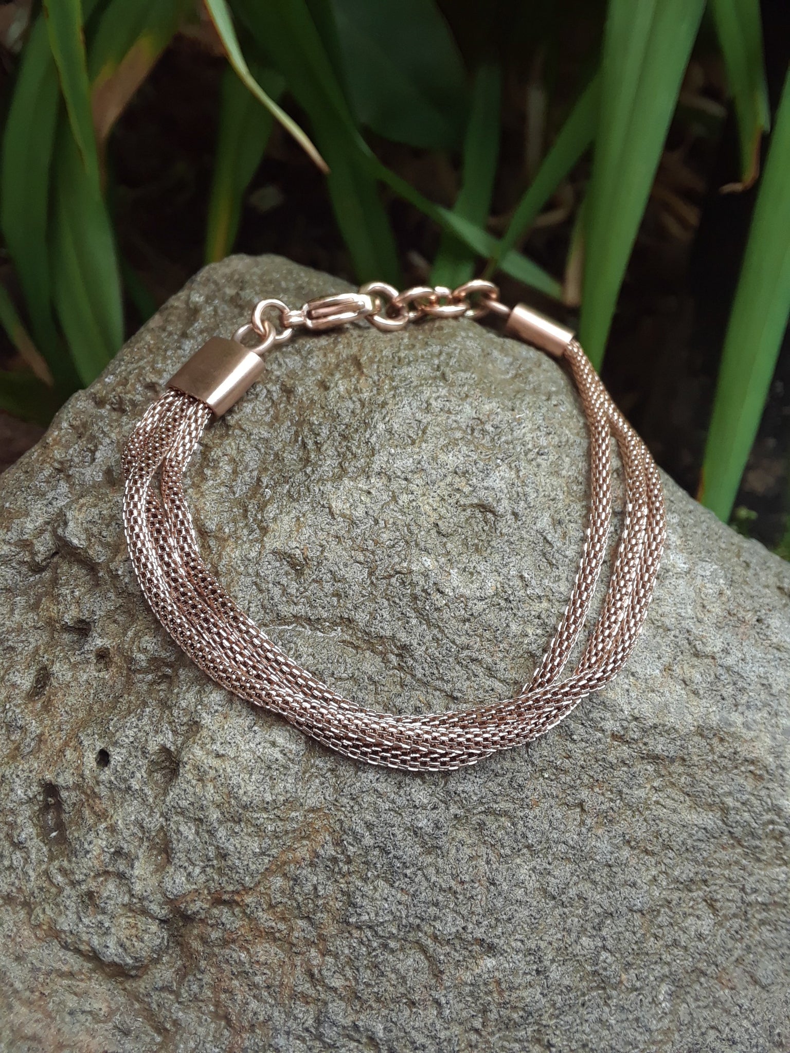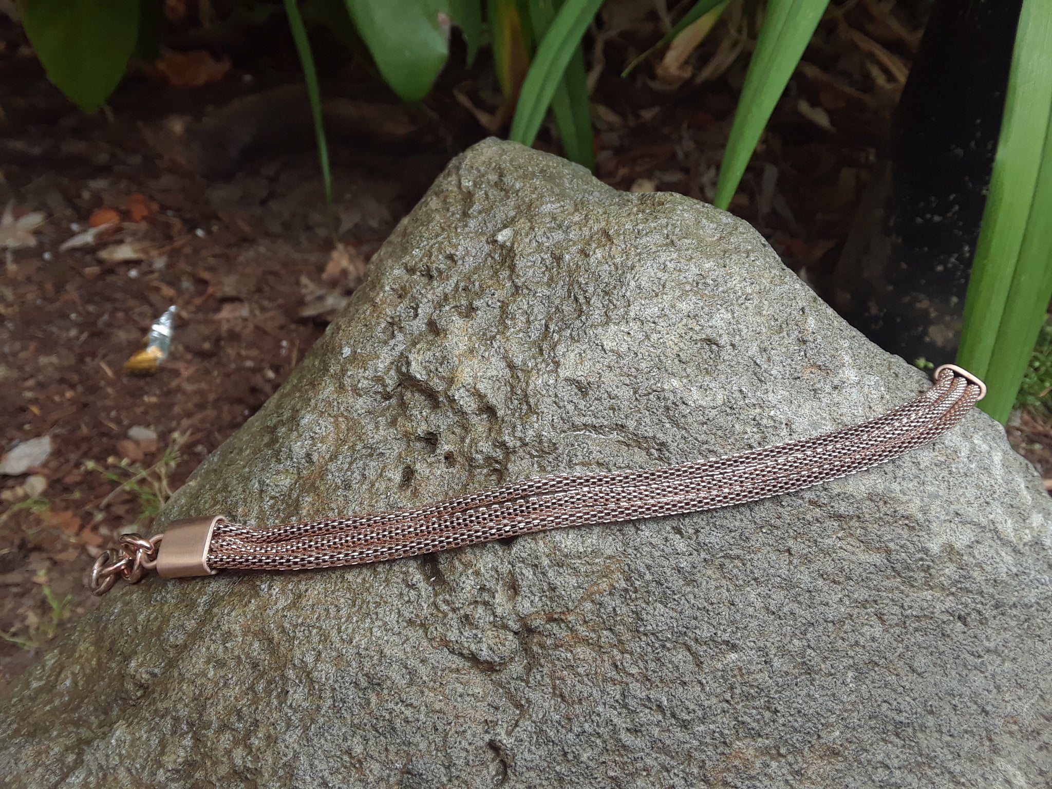 This 7" long adjustable mesh bracelet is rose plated stainless steel. Lightweight and durable this 3 strand mesh bracelet is simple and elegant.  Very smooth and flexible for everyday comfort.