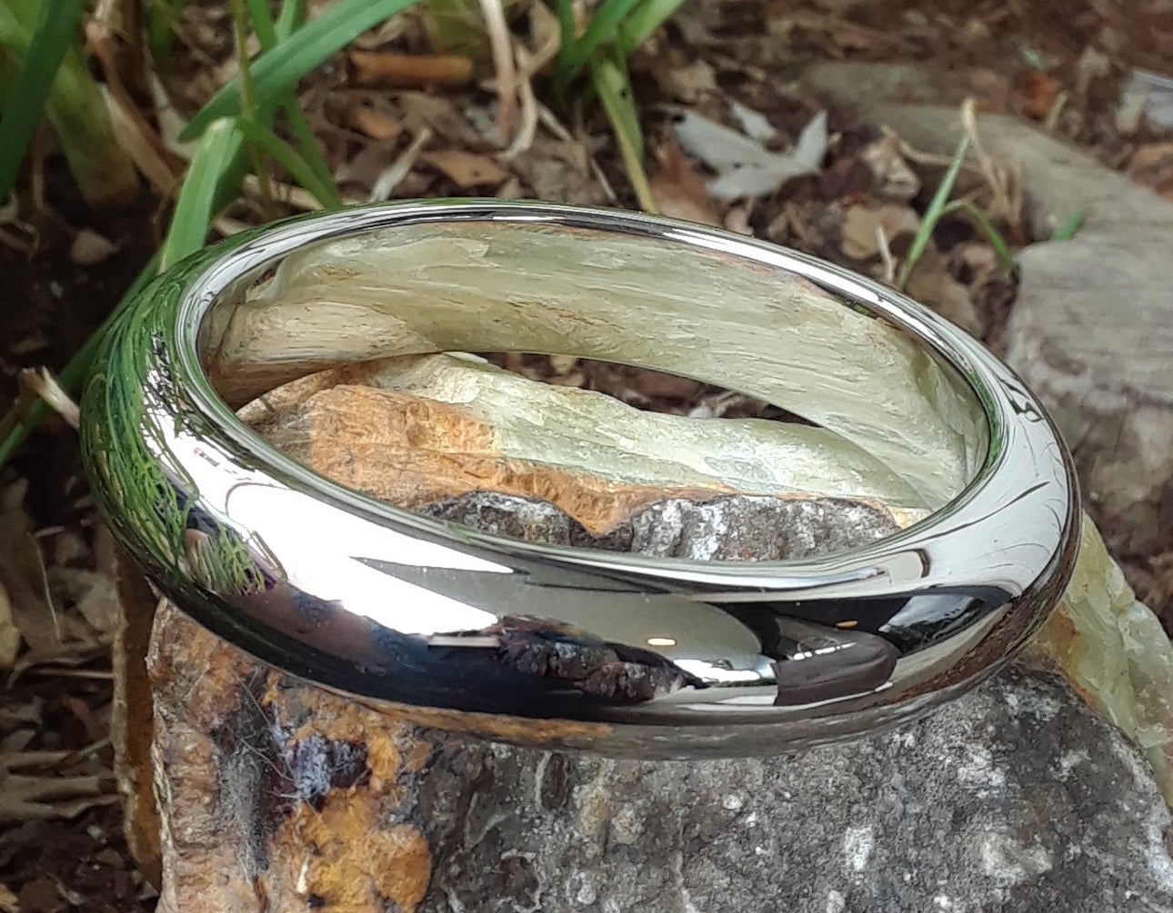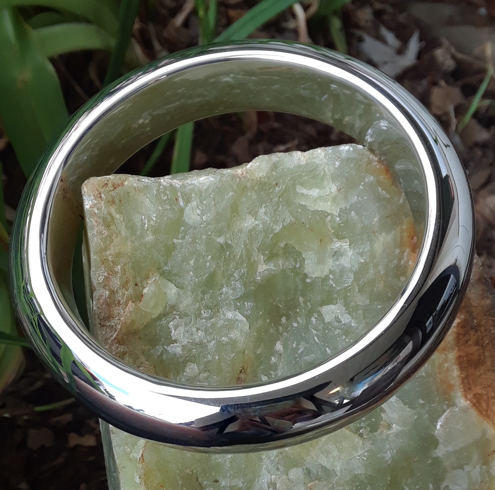 This 15 mm wide, half-round, hollow stainless steel bangle bracelet has a bright, high-polished, mirror-like finish. A nice compliment to any style, classic and bold. And a great layering option for other bangle bracelets.
