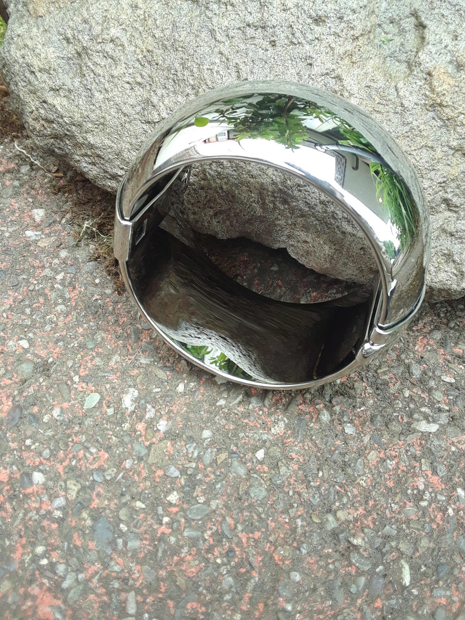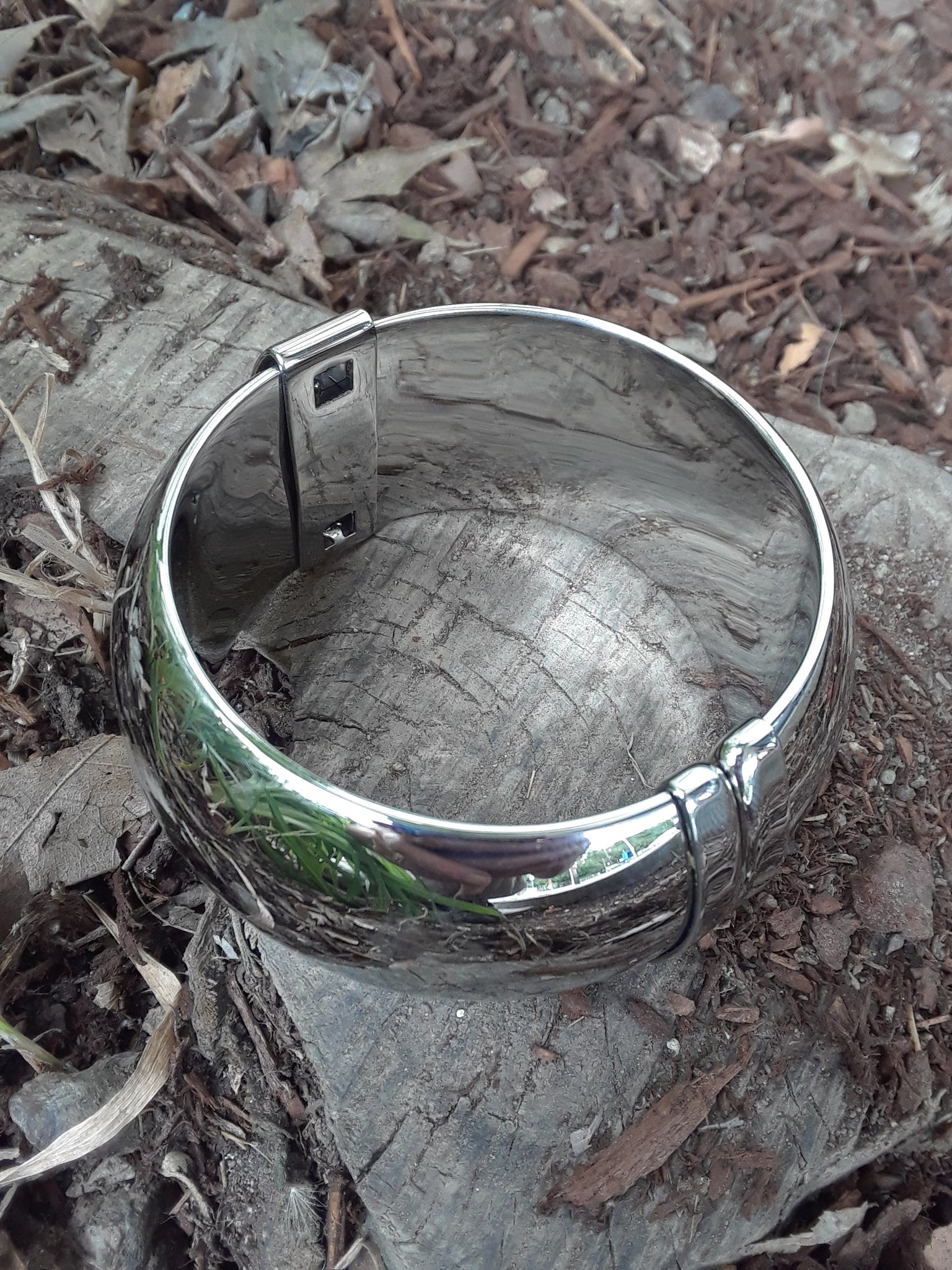 This large 35 mm wide stainless steel cuff style, bangle bracelet has a hinge for easy opening and closing and a magnetic ball with hole clasp. With high polished steel, this bracelet is bright and mirror-like, creating reflections and light to any style. This unique bracelet with hinge is a great bangle addition to any collection.