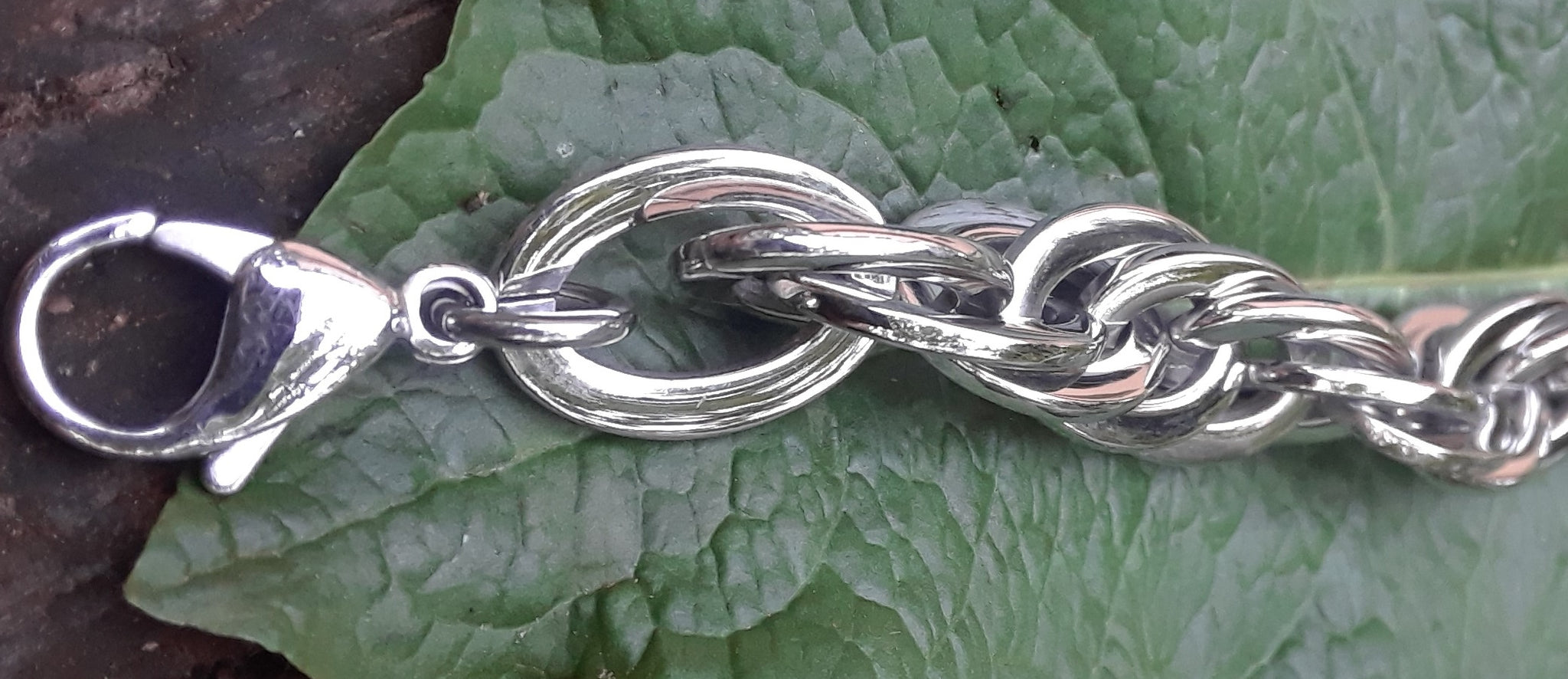 This stainless steel rope style, chain bracelet is 7" long and 14 mm wide with a lobster clasp. This bracelet has the look of rope or twine as it rolls on the wrist. This unique chain is bold and classic. With it's high-polished, mirror-like finish this bracelet is perfect for any style.