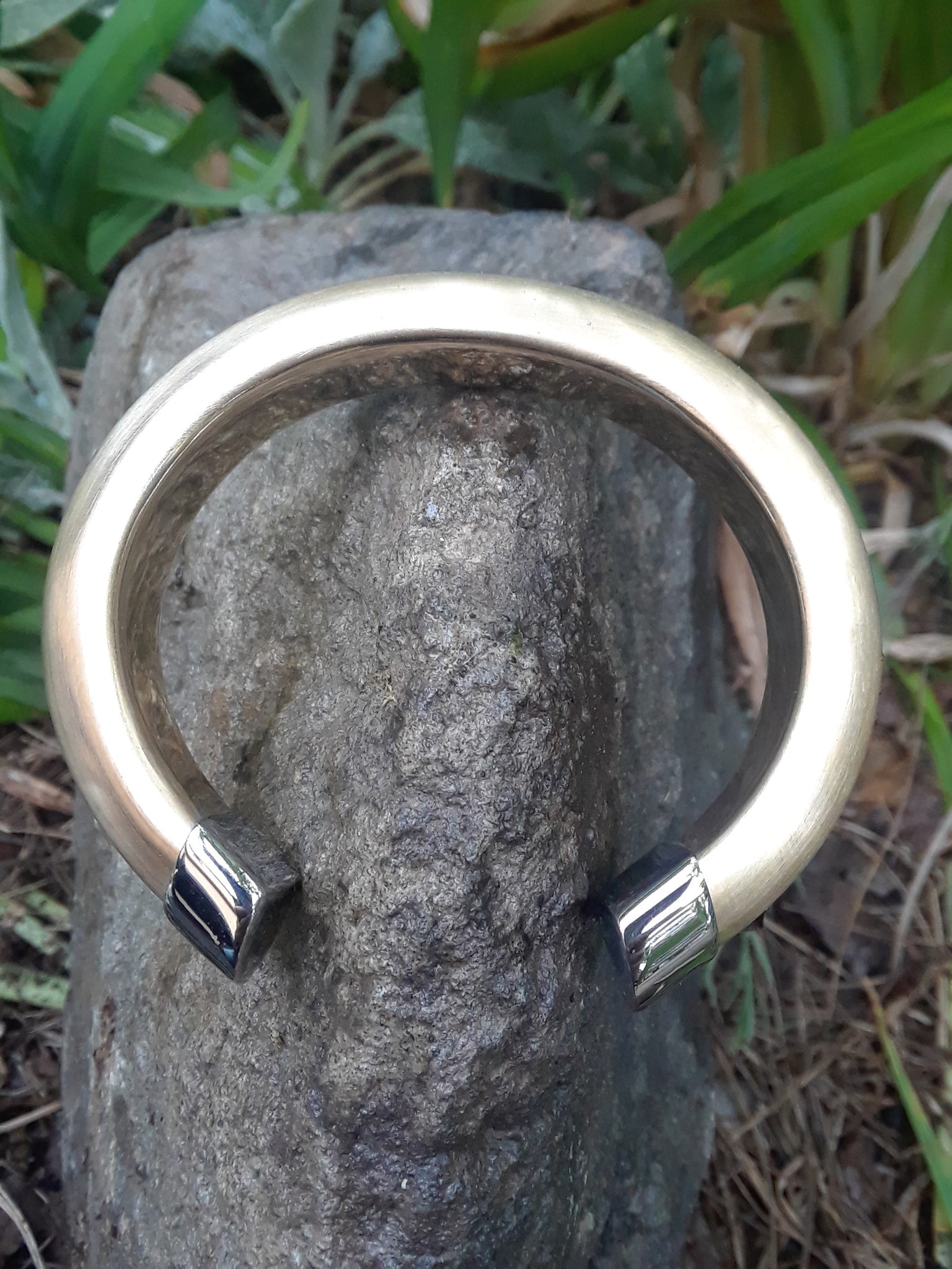 A combination of brushed-finished brass with high-polished stainless steel end caps, this cuff style bracelet will match other jewelry item and looks great on all skin tones. With a mirror-like finish on the inside, which makes this 15 mm wide cuff bracelet smooth and comfortable for everyday wear.